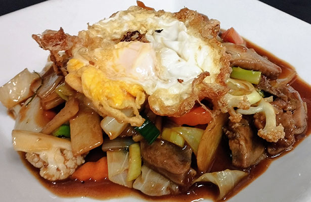 Oyster Sauce Pork BellyCrunchy, juicy pork belly pieces stirfried with Oyster sauce and seasonal vegetables. Topped with a fried egg. |